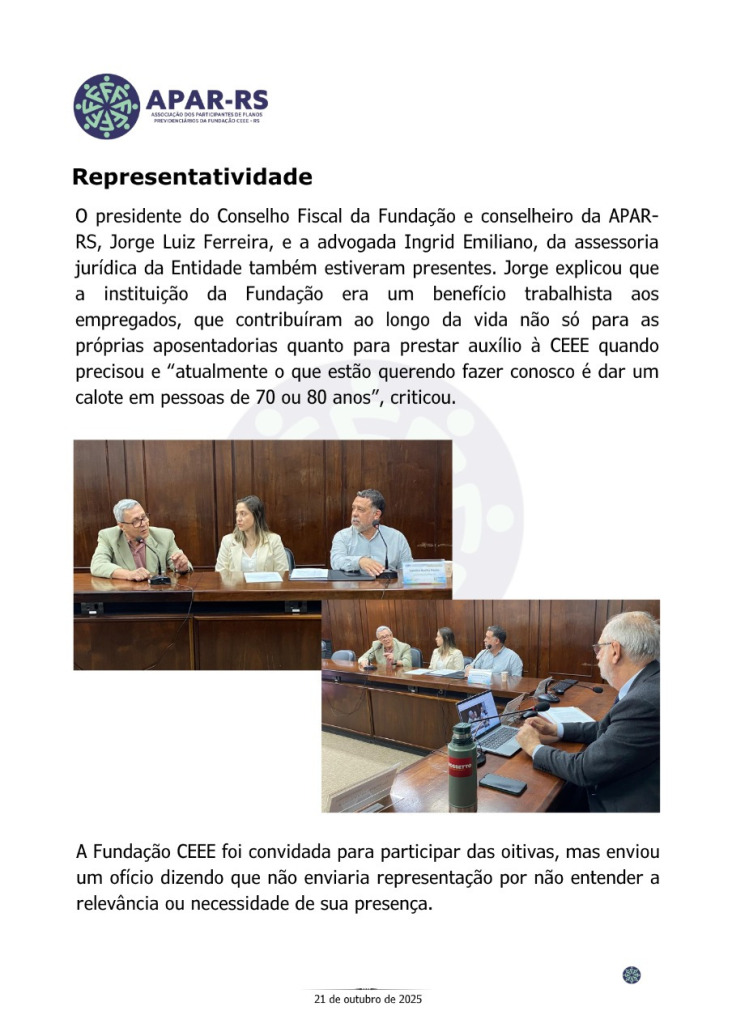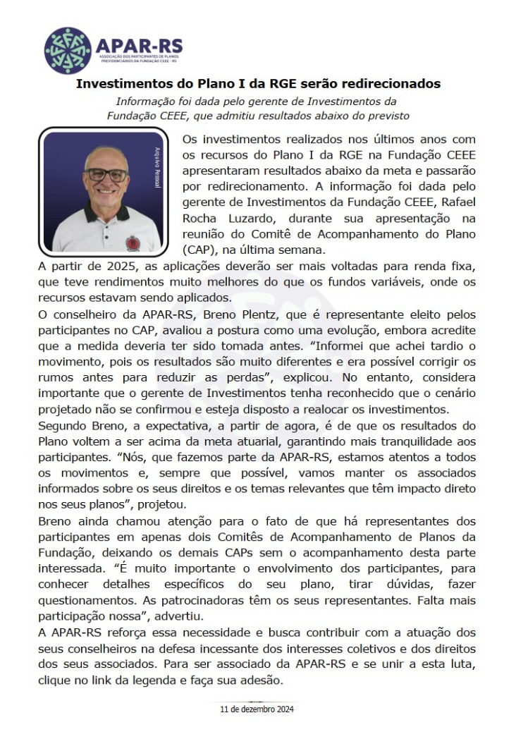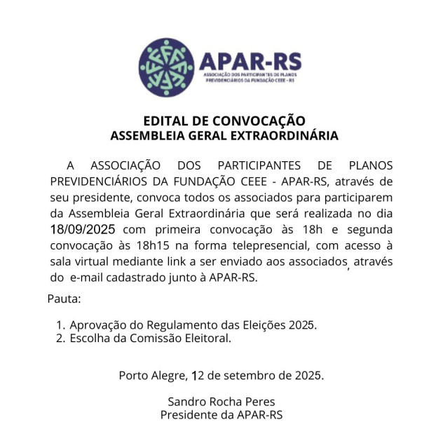 Diante da ameaça concreta de que as empresas privadas que compraram a CEEE retirem o patrocínio dos planos previdenciários, Único e CEEEPrev, afetando diretamente a aposentadoria de milhares de eletricitários, dependentes e pensionistas, vinculados a estes planos, foi criada, em 27 de janeiro de 2022, a Associação dos Participantes de Planos Previdenciários da Fundação CEEE - APAR-RS.