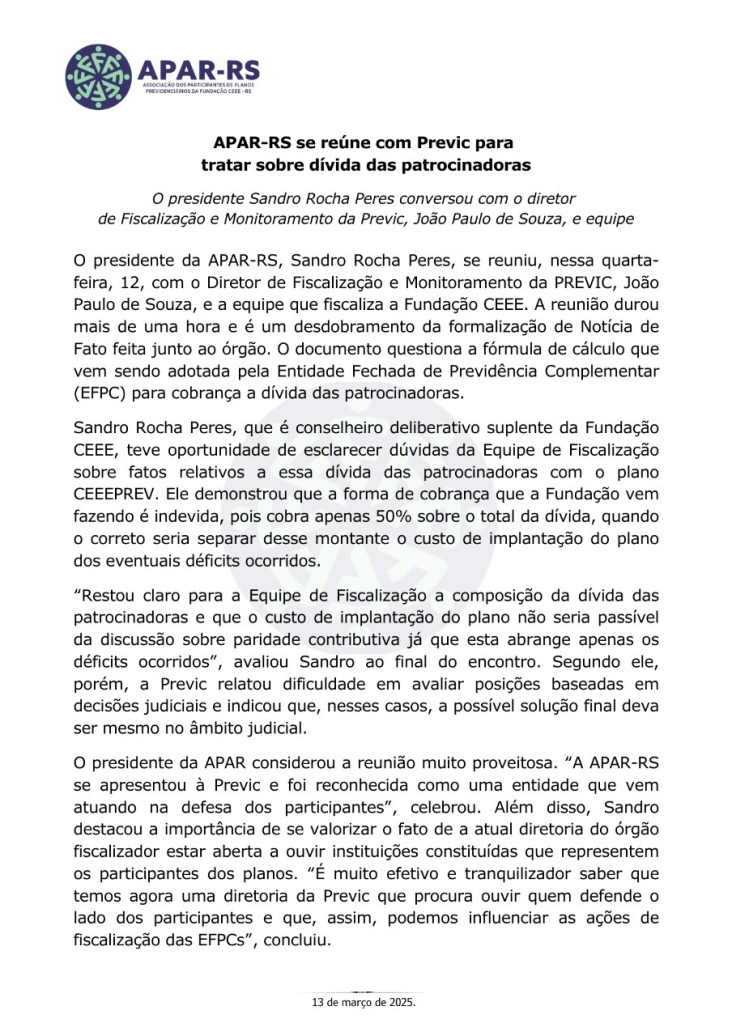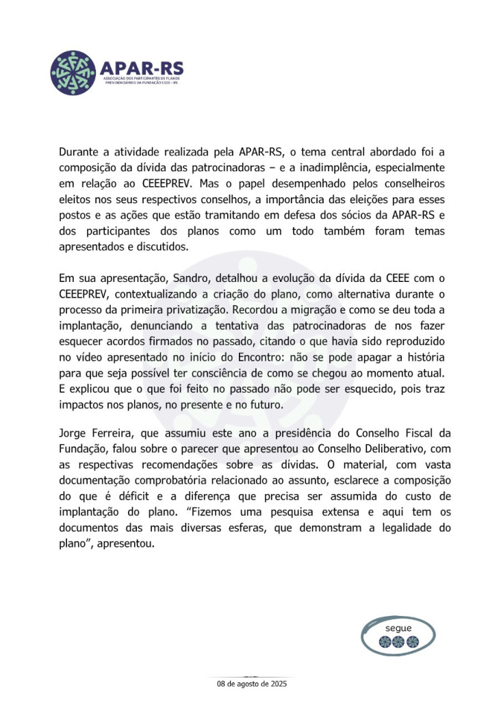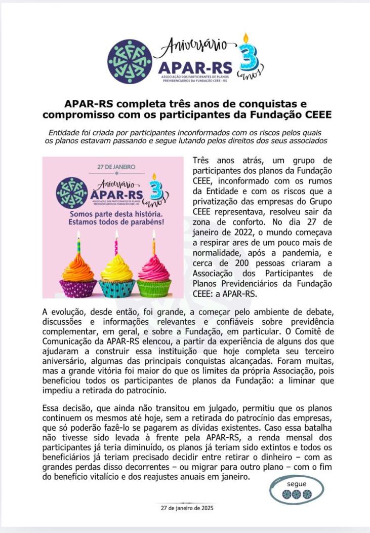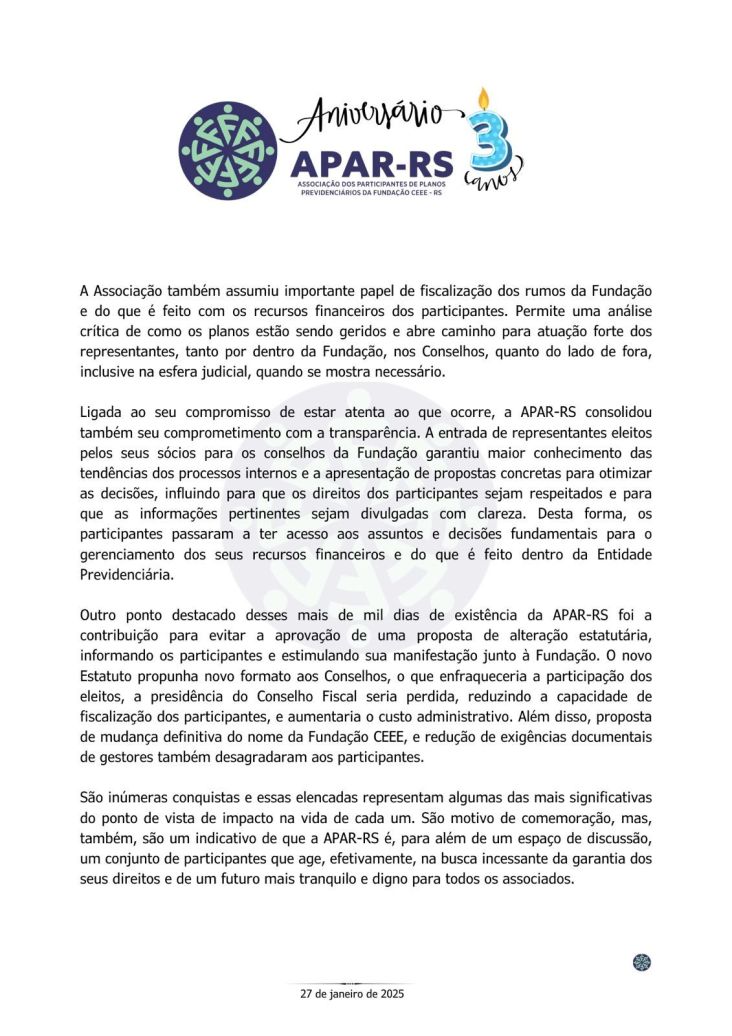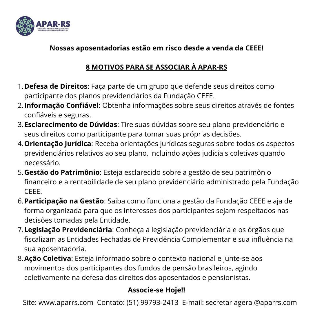 Diante da ameaça concreta de que as empresas privadas que compraram a CEEE retirem o patrocínio dos planos previdenciários, Único e CEEEPrev, afetando diretamente a aposentadoria de milhares de eletricitários, dependentes e pensionistas, vinculados a estes planos, foi criada, em 27 de janeiro de 2022, a Associação dos Participantes de Planos Previdenciários da Fundação CEEE - APAR-RS.
