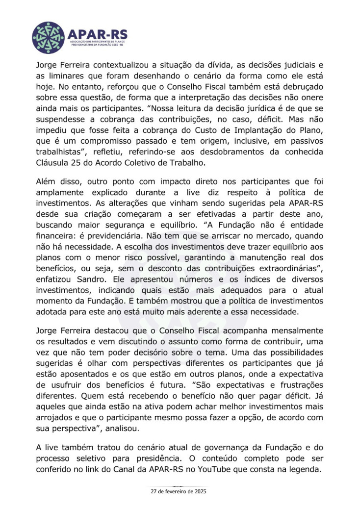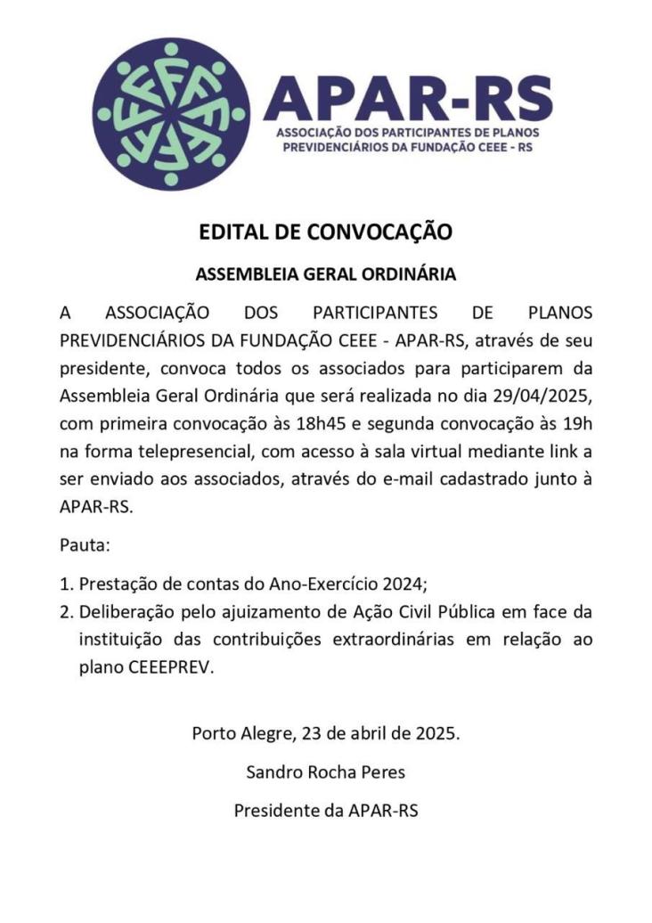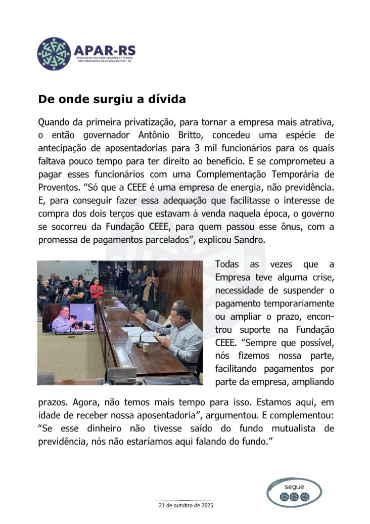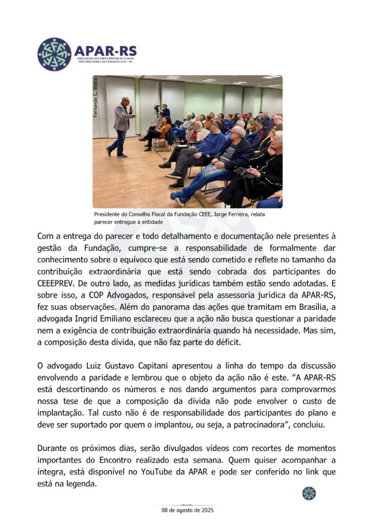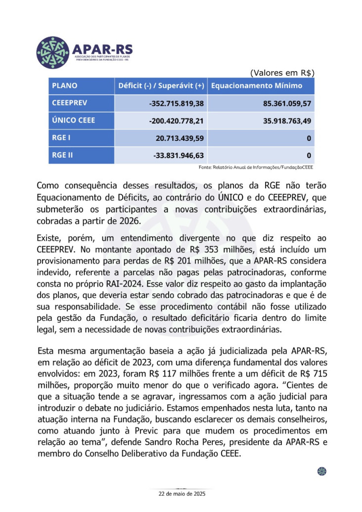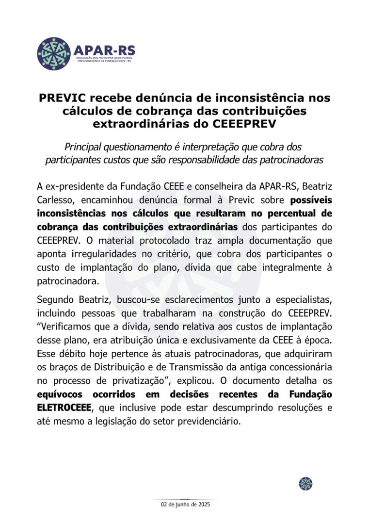 Diante da ameaça concreta de que as empresas privadas que compraram a CEEE retirem o patrocínio dos planos previdenciários, Único e CEEEPrev, afetando diretamente a aposentadoria de milhares de eletricitários, dependentes e pensionistas, vinculados a estes planos, foi criada, em 27 de janeiro de 2022, a Associação dos Participantes de Planos Previdenciários da Fundação CEEE - APAR-RS.