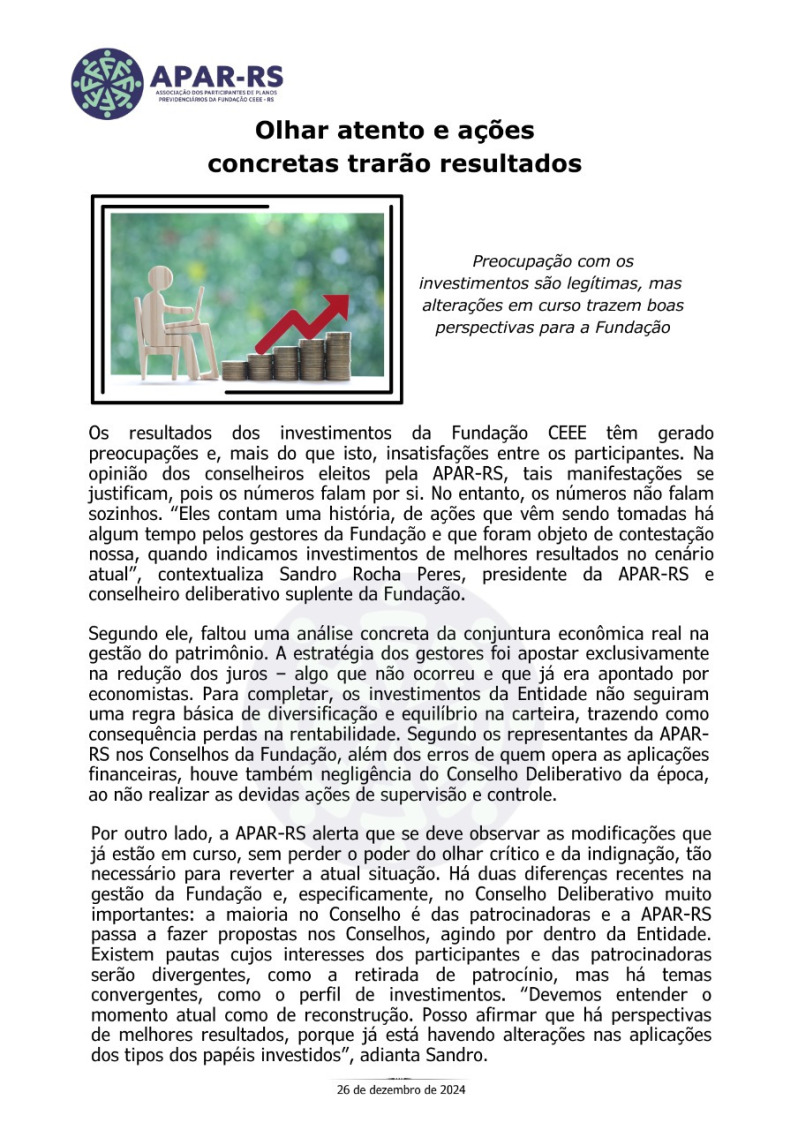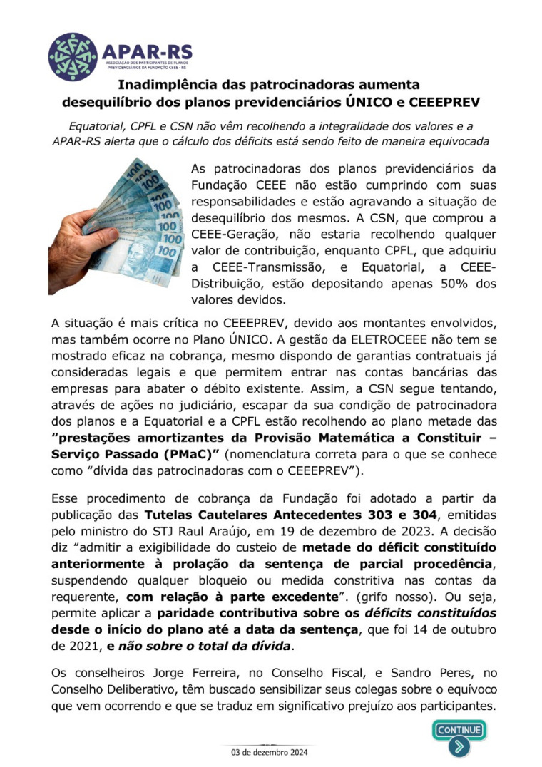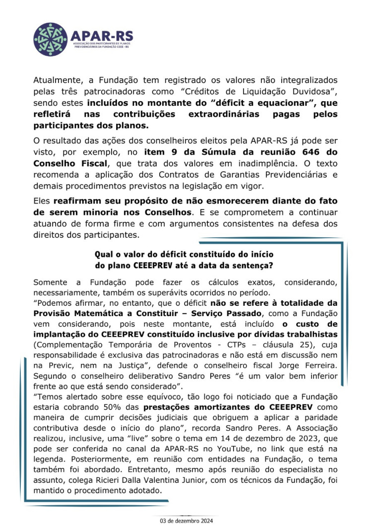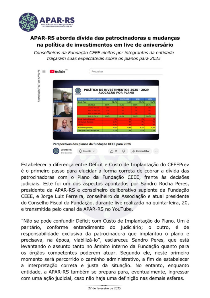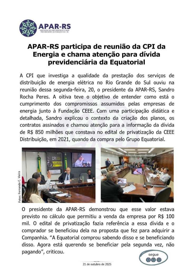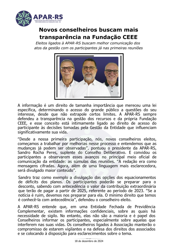 Diante da ameaça concreta de que as empresas privadas que compraram a CEEE retirem o patrocínio dos planos previdenciários, Único e CEEEPrev, afetando diretamente a aposentadoria de milhares de eletricitários, dependentes e pensionistas, vinculados a estes planos, foi criada, em 27 de janeiro de 2022, a Associação dos Participantes de Planos Previdenciários da Fundação CEEE - APAR-RS.