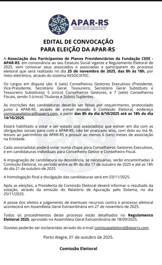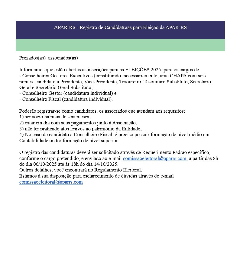 A APAR-RS agradece a confiança dos eleitores, demonstrada pela expressiva votação dos candidatos!