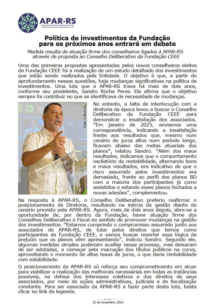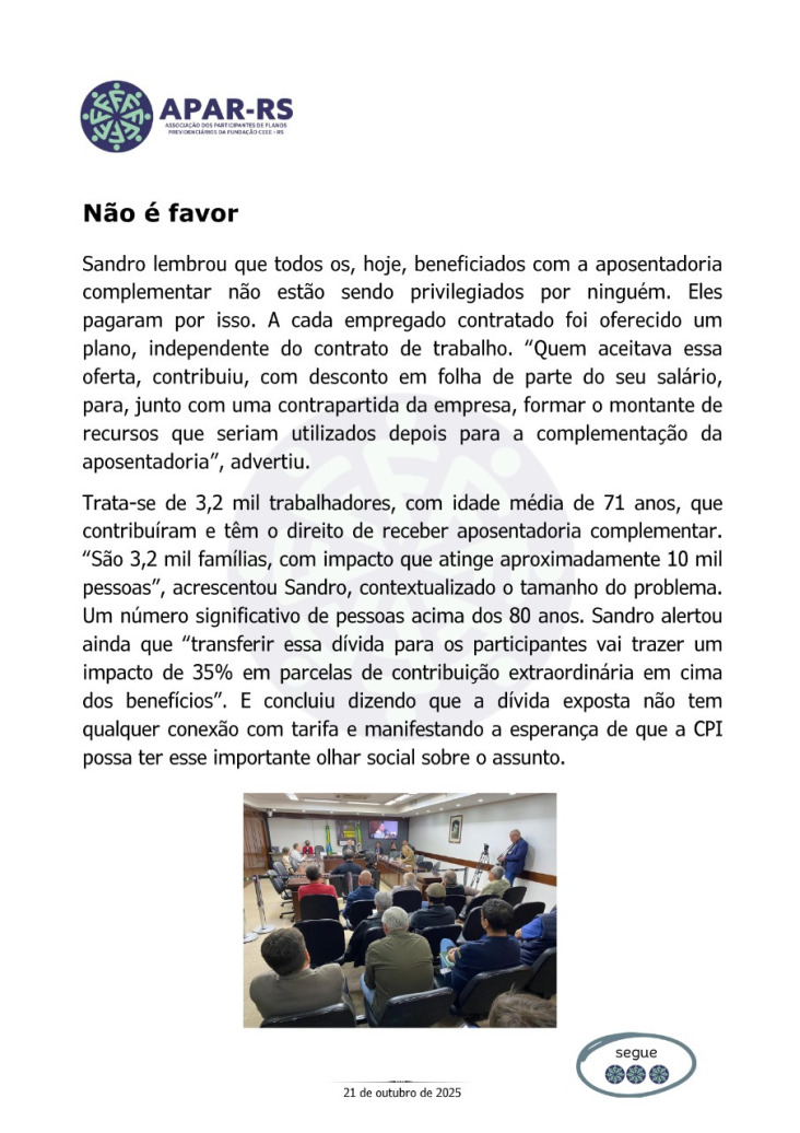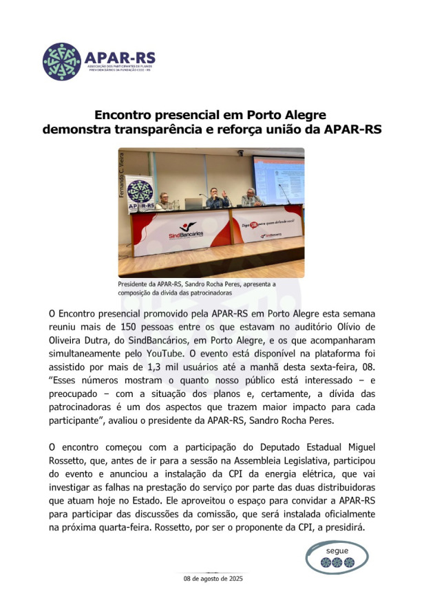 Em um encontro em Arroio Grande, o Deputado Federal Pompeo de Mattos (PDT-RS), transmitiu seu apoio à APAR-RS, através do conselheiro da APAR-RS Dagoberto Pinto, e confirmou seu empenho com ações no Congresso Nacional, na defesa dos direitos dos participantes de fundos de pensão."
